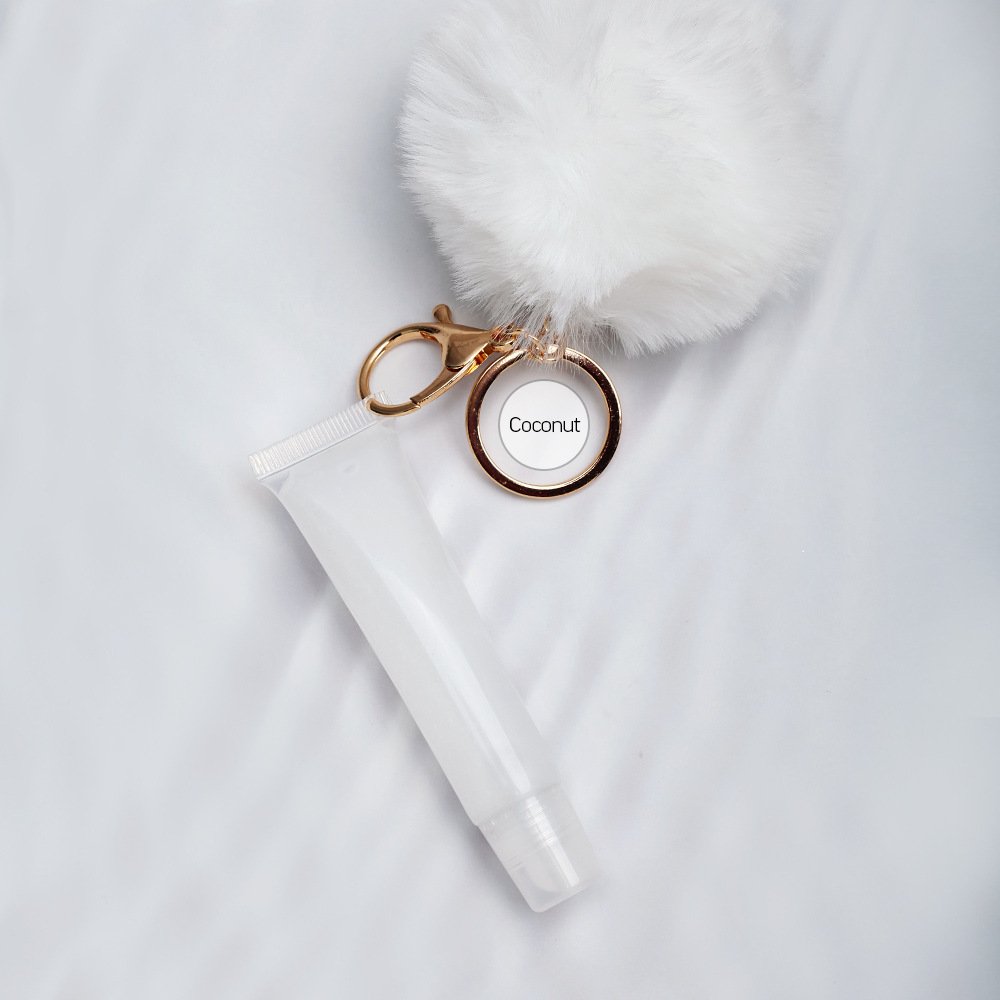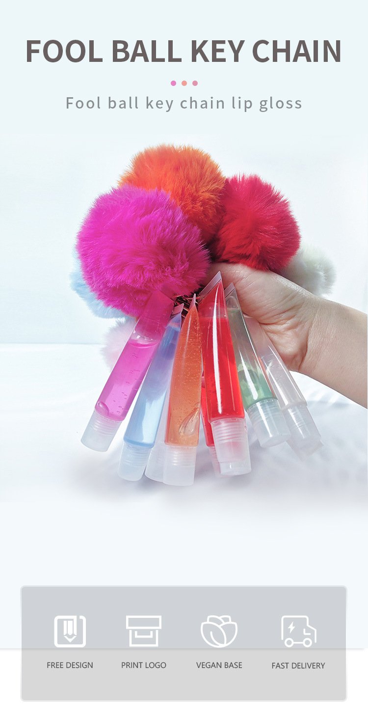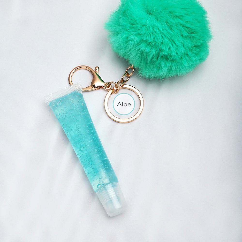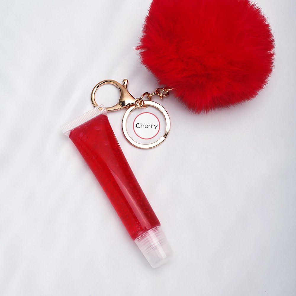 Vegan Clear/Scented Lipgloss & Cute Puffy Pom Pom Keychain Set. Clip it on your Purse, Backpack, or even keys and add some yummy shine to your lips while on the go.